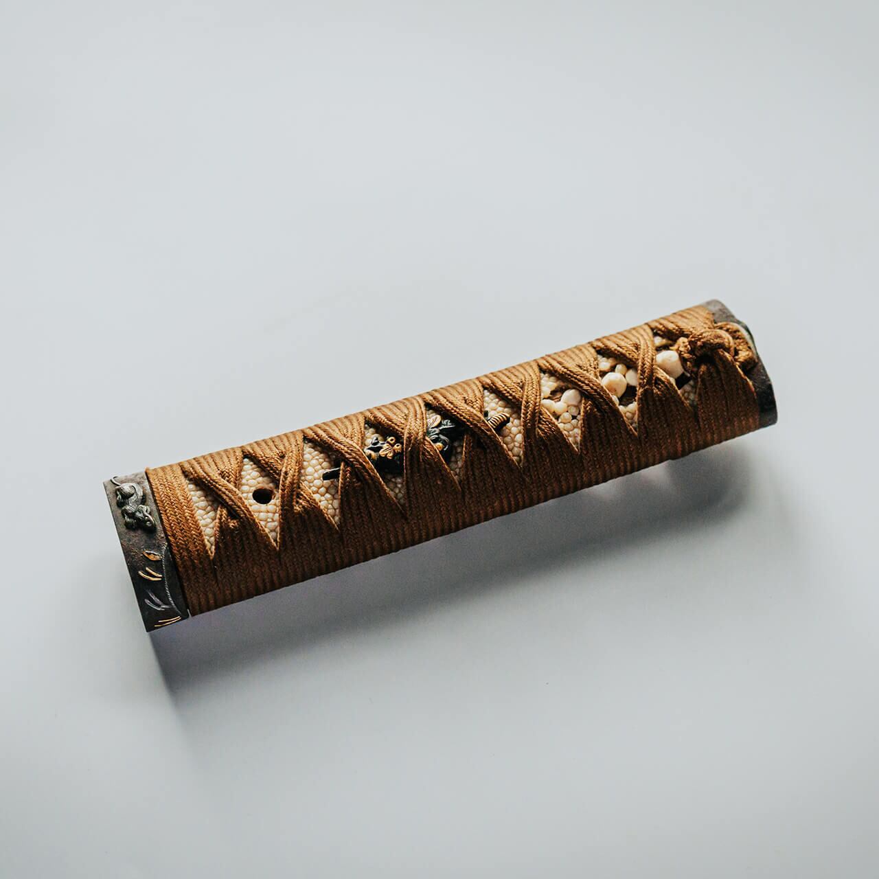 柄(つか)は、日本刀を握って掴むための部分。鮫皮(さめがわ)を巻き付けた上に黒漆を塗り、革緒や組紐で巻き締めた物が多いが、なかには錦を着せたり、金や銅でできた薄い板を張っていたりするなど、その材料は様々です。